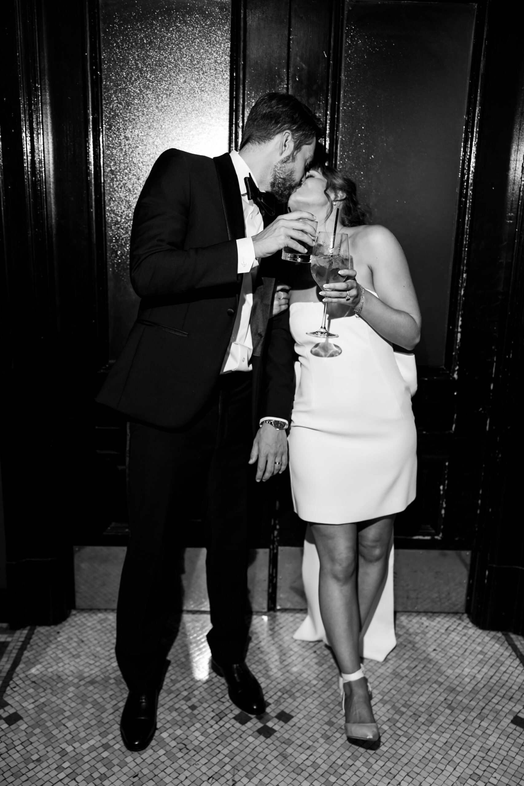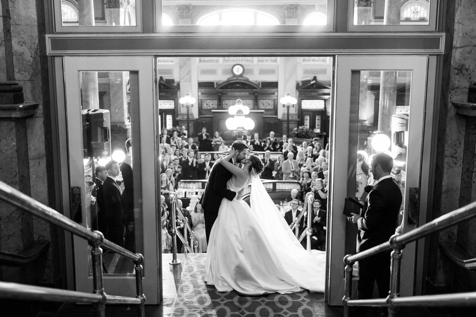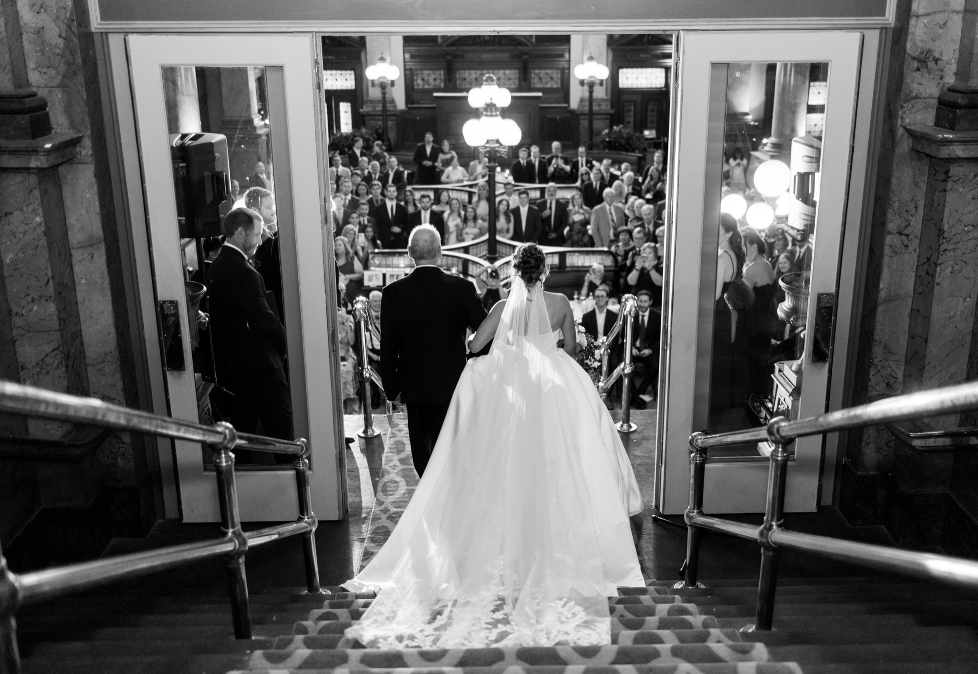 But what makes it so special for weddings today is how seamlessly it balances that historic grandeur with modern sophistication. The warm, golden light pouring through the glass dome ceiling lends itself beautifully to contemporary photography. And the mix of marble, wood, and brass details creates a backdrop that looks stunning whether you’re planning a black-tie affair or a more understated, chic celebration.