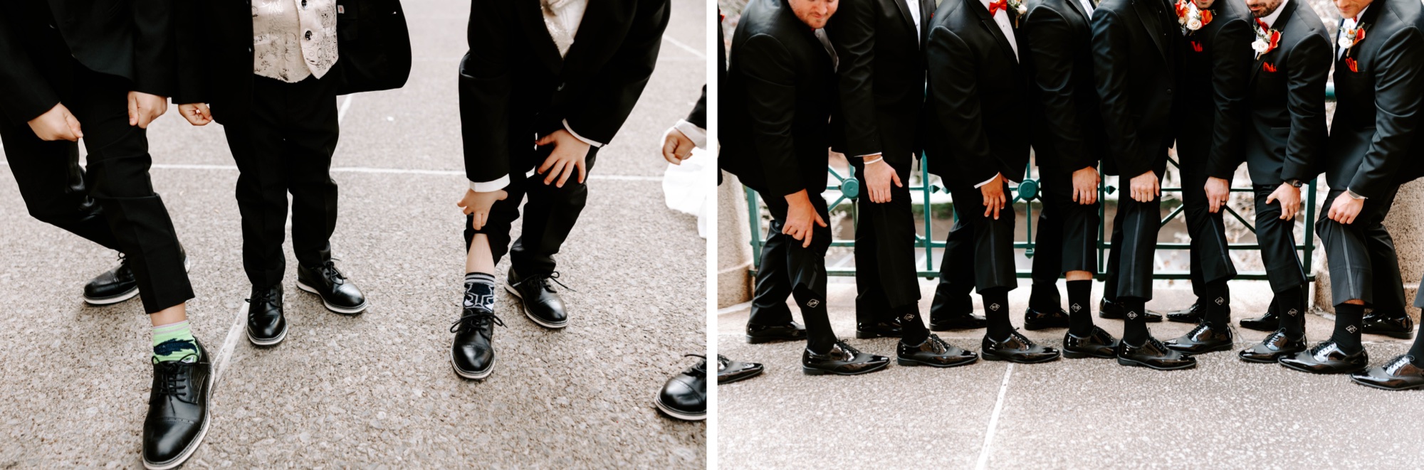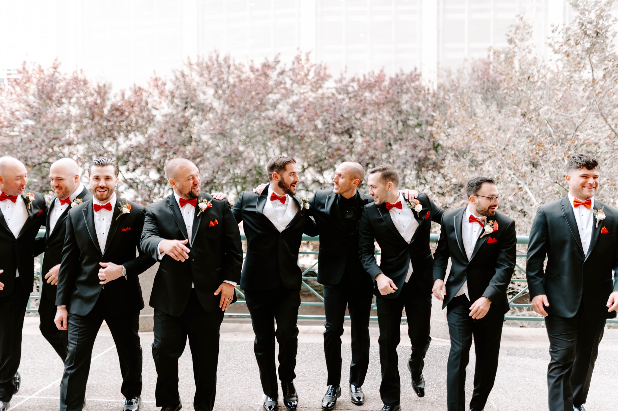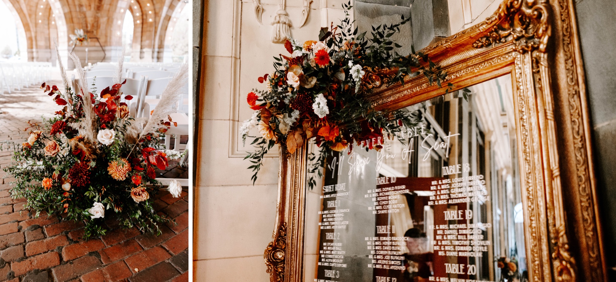 By the time Sydney and Kyle’s wedding day arrived, the crisp fall air had fully settled in. Rather than shying away from the season, they leaned into it. Warm, fall-inspired florals added rich texture and color, perfectly complementing the venue’s historic tones. The wedding party wore full-length velvet red dresses for the ladies and dark suits for the guys. It was an effortlessly elegant palette that felt equally luxurious, cozy, and timeless.