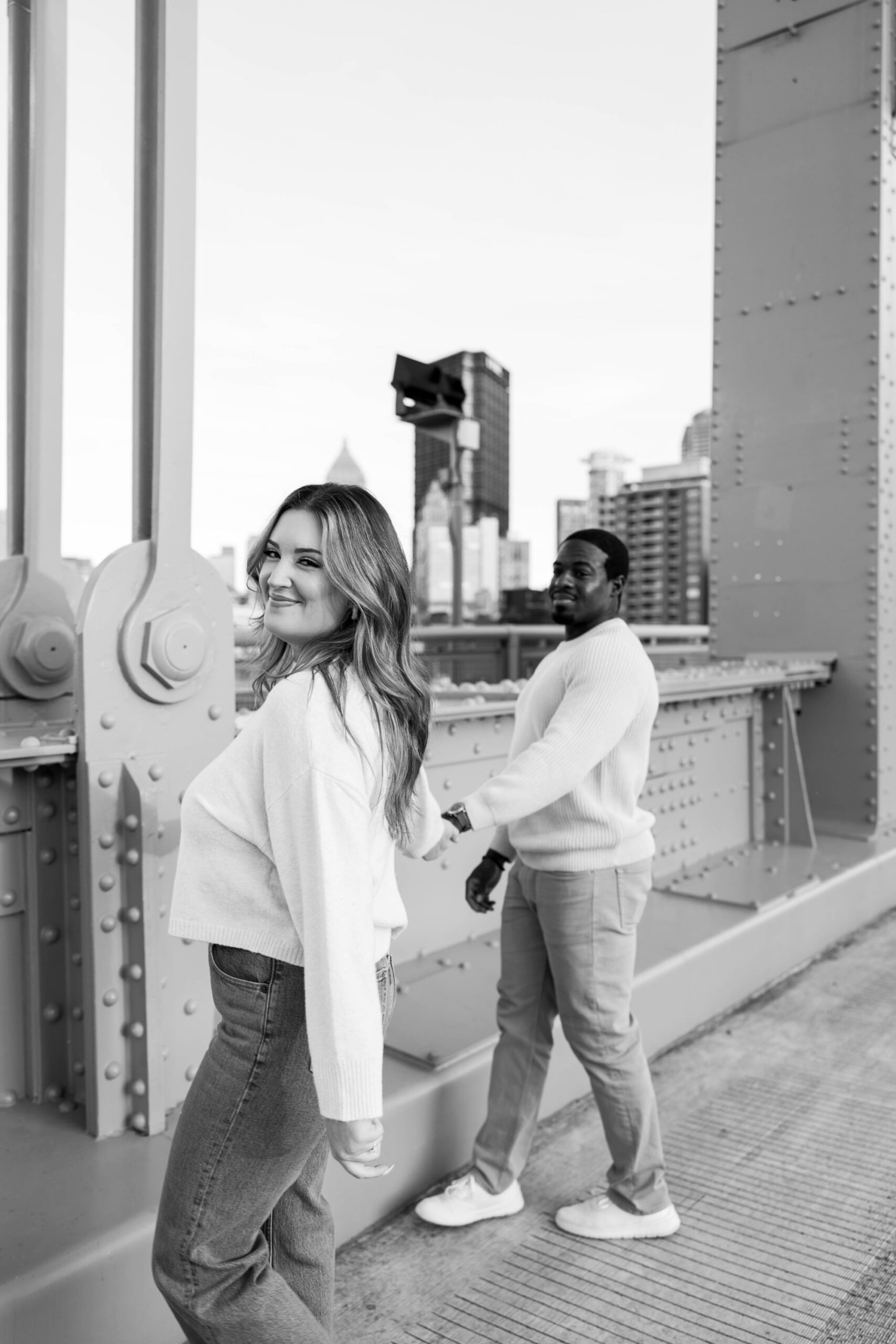 Starting on the familiar yellow bridge gave us airy, movement-filled portraits with Pittsburgh’s golden skyline glowing behind them. The steel architecture, open sky, and warm late-afternoon light told a story of vibrancy and new beginnings (with some adorable flirtation tossed in).